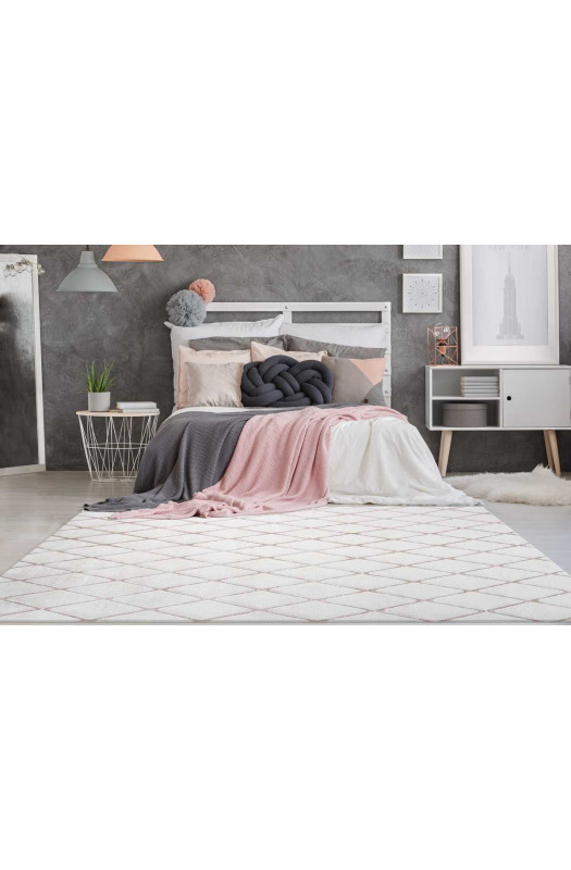 Стильний дизайн килима Vivica 225 romb White/Rose 80х150 стане відмінним доповненням будь-якого дизайнерського рішення. Оригінальна геометрія з 3D ефектом надає інтер’єру елегантність і сучасний вигляд. Неймовірно приємна на дотик поверхня створює атмосферу затишку.