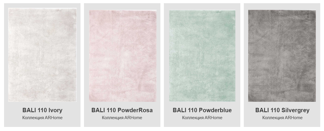 Ivory (світлий беж), Powderblue (ніжно-блакитний), Powderrosa (пудовий рожевий) и Silvergrey (сріблясто-сірий), які відмінно впишуться в будь-який сучасний дизайн-проект, привнесуть в обстановку затишок і ніжність. Високий ворс з мікро-пряжі подарує приємні тактильні відчуття і почуття невагомості при кожному кроці.