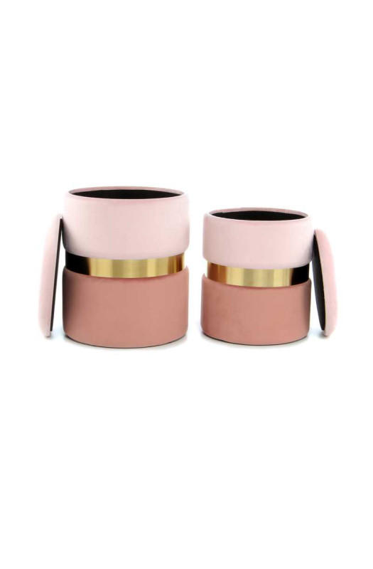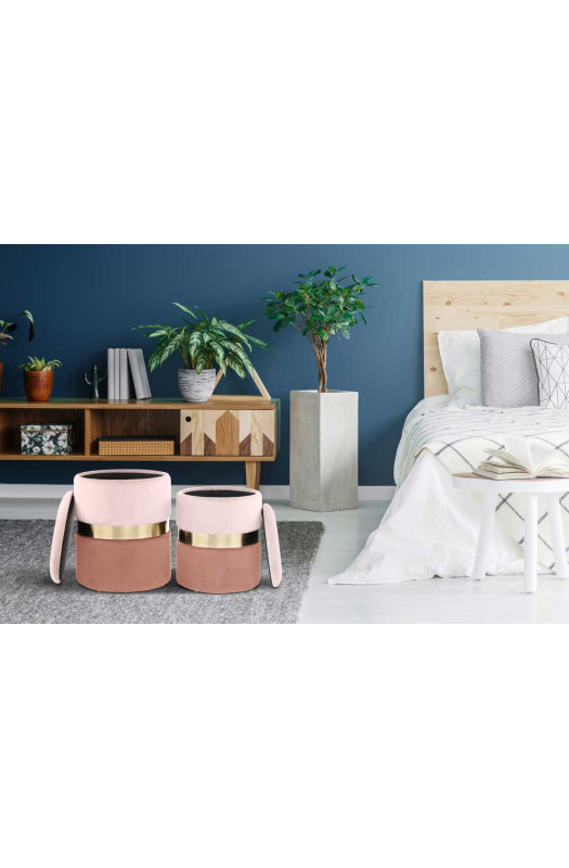 Комплект пуфів для сучасного інтер'єру Набір Derby Pink / Dark pink складається з двох пуфів різних розмірів. Оббивка виробів виконана в двох відтінках - ніжної троянди і темно-рожевий. Елегантне металеве кільце в золотому кольорі з'єднує дві частини пуфа, додаючи йому вишуканість. Під сидінням розташований зручний короб для зберігання книг, журналів, зарядних пристроїв та інших дрібниць. У наповненні сидіння використовується пінополіуретан, а оббивка виконана з приємною на дотик оксамитової тканини. Таке поєднання матеріалів забезпечує комфортний відпочинок. Пуф можна використовувати в якості додаткового місця або як підставку під ноги. Перевага Derby - компактні розміри. Це дозволяє сміливо використовувати пуфи навіть в малогабаритних приміщеннях. Вони відмінно виглядатимуть поряд з журнальним або кавовим столиком в lounge-зоні.