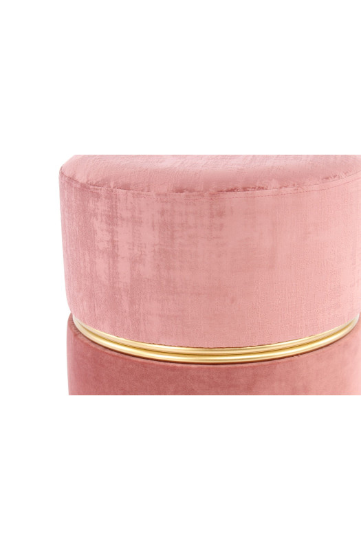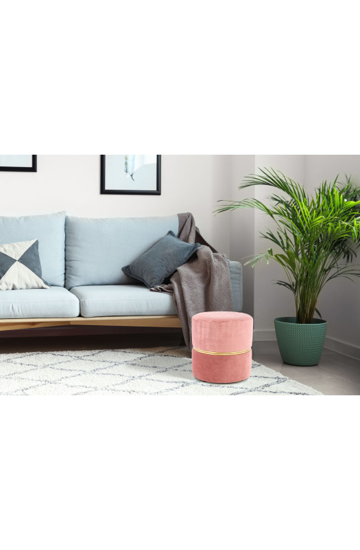 Для обивки используются ткани с разными текстурами, что вносит контраст. Нижняя часть обладает приятной бархатистостью, а вот текстиль вверху слегка фактурный. Соединяет две части пуфа металлическое кольцо в золотом оттенке, придающее изделию особый шарм.