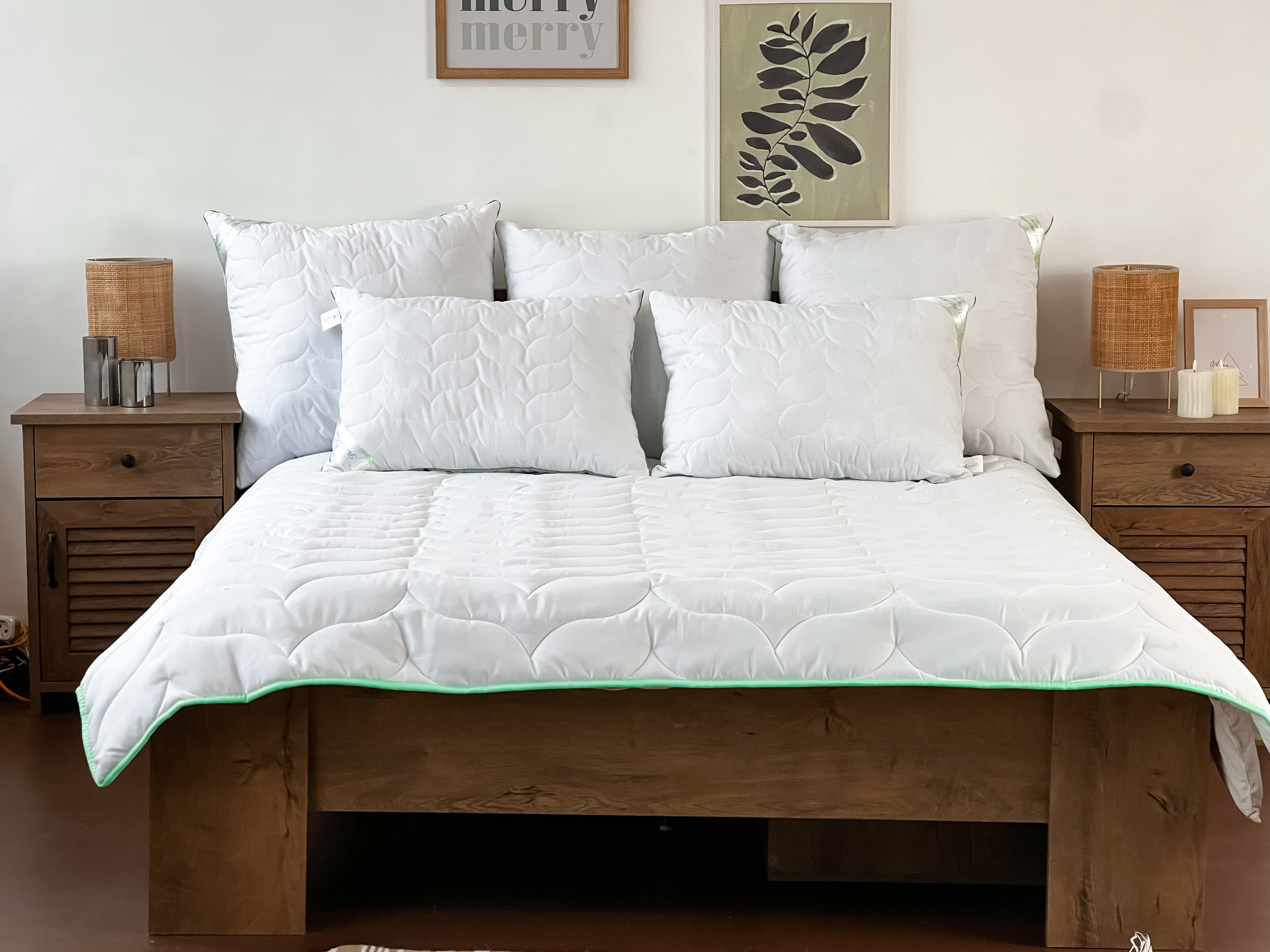 Белые подушки и одеяла идеально сочетаются с разными интерьерными решениями комнаты: светлыми, темными, пастельными и даже яркими цветами. Белые постельные принадлежности легко дополнить, например, пледом или покрывалом из натуральных материалов, что придаст текстуру и глубину помещению.