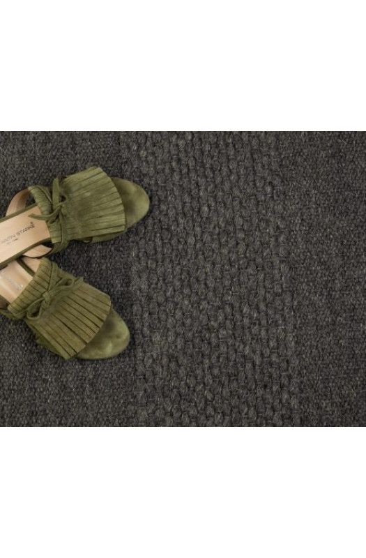 Модель выполнена в оттенке тёмного шоколада. Ковёр на 100% изготовлен из натурального хлопка, что делает повышает прочность и износостойкость изделия. В основе изделия — шерсть.