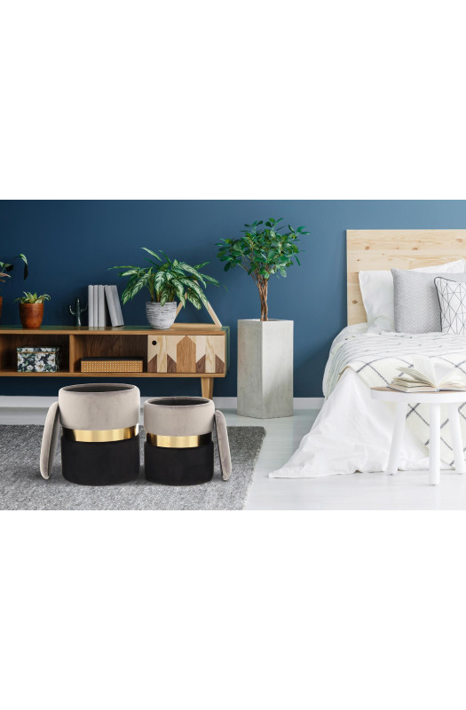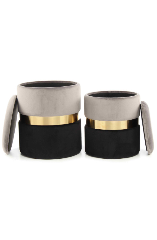 Набор Derby T125/2 Grey/Gold/Black состоит из двух пуфов разных размеров. Обивка изделий выполнена в оттенках — серый, чёрный. Элегантное металлическое кольцо в золотом цвете соединяет две части пуфа, добавляя ему изысканность.
