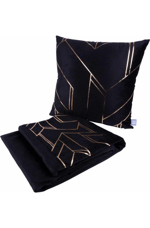 Набір подушка і плед Prisma 125 Black/Gold призначений для декорування віталень, спальних кімнат, а також relax-просторів і лаундж-зон. До нього увійшли два вироби: подушка в розмірі 45х45 см і плед 130х170 см. Вироби виконані в чорному кольорі з золотистим принтом у вигляді поздовжніх ліній.