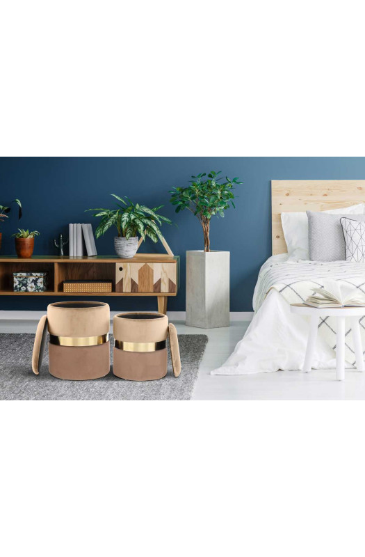 Набор Derby Lightbrown/Gold/Brown состоит из двух пуфов разных размеров. Обивка изделий выполнена в двух оттенках — бежевом и шоколадном. Элегантное металлическое кольцо в золотом цвете соединяет две части пуфа, добавляя ему изысканность.
