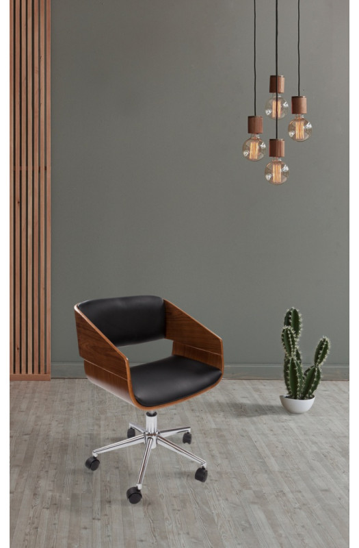Сдержанный дизайн, позволяет использовать модель в любых дизайнерских решениях от модерна до минимализма. Спинка и сиденье выполнены в экокоже чёрного цвета, а подлокотники стилизованы под дерево. Устойчивость обеспечивают металлические ножки на колёсиках в оттенке chrome.