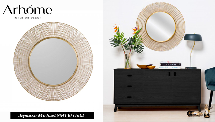 Круглое зеркало Michael SM130 Gold в позолоченной раме из металла. Диаметр – 89,5 см. За счет дизайнерского решения сделать раму не цельнометаллической, а состоящей из тоненьких прутьев, изделие смотрится элегантно, ненавязчиво и «воздушно».