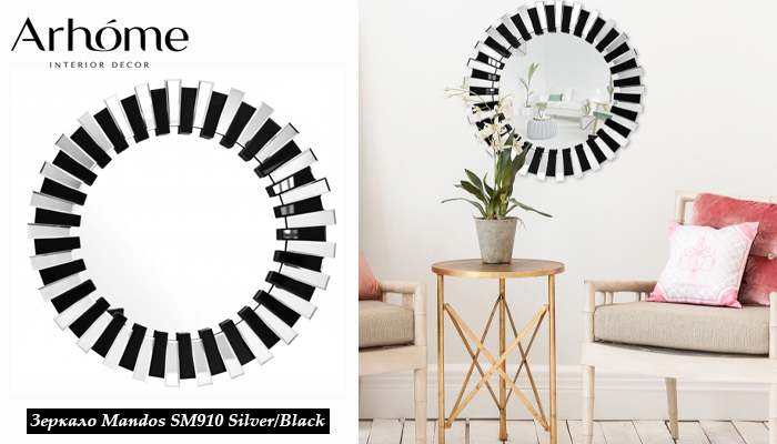 Настенное зеркало Mandos SM910 Silver/Black в дизайнерской раме из черных и серебристых стеклянных элементов. Диаметр – 80 см. Изделие органично впишется в современную гостиную, спальню или ванную комнату.