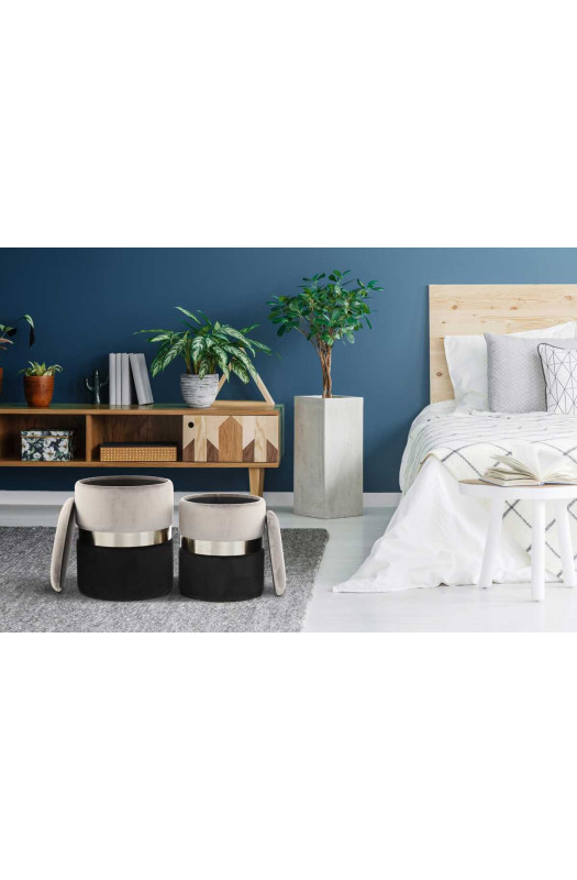 Набор Derby Grey/Black состоит из двух пуфов разных размеров. Обивка изделий выполнена в двух оттенках — сером и чёрном. Элегантное металлическое кольцо в серебристом цвете соединяет две части пуфа, добавляя ему изысканность.