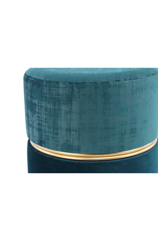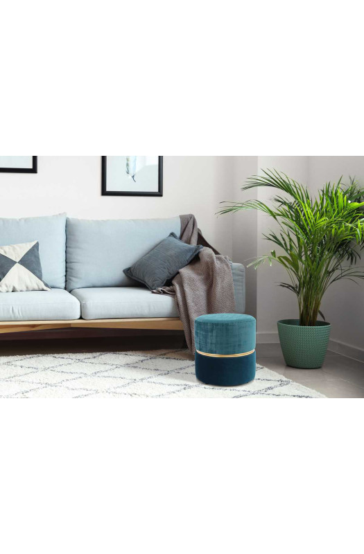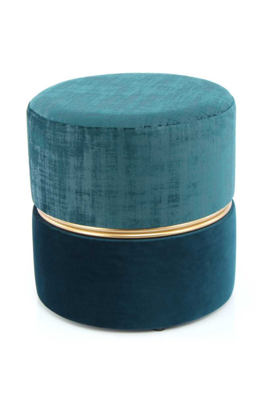Для обивки используются ткани с разными текстурами, что вносит приятный контраст. Нижняя часть обладает бархатистостью, а текстиль вверху слегка фактурный. Соединяет две части пуфа металлическое кольцо в золотом оттенке, придающее изделию особый шарм.
