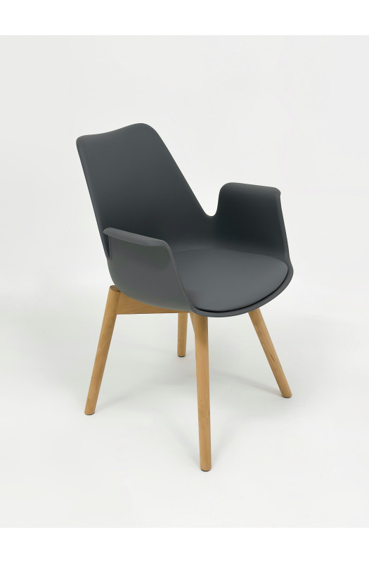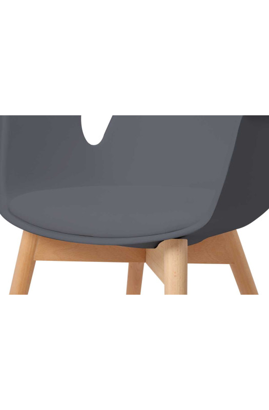Дизайн модели привлекает внимание. Корпус изделия выполнен из современного пластика в сером оттенке, мягкое сиденье создаёт комфорт, а светлые деревянные ножки вносят необходимый контраст.