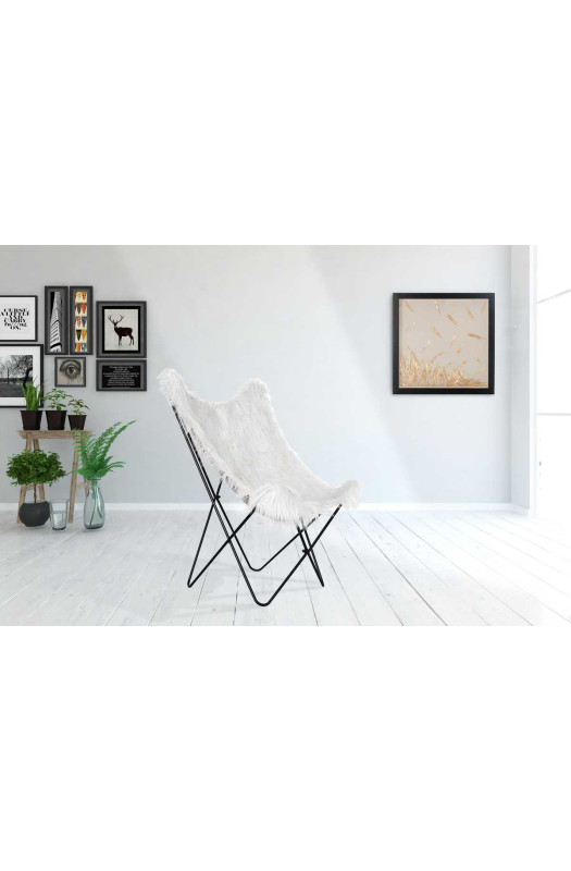 Затишне крісло-метелик в техніці handmade Крісло Mira White - ексклюзивне рішення для меблювання сучасного інтер'єру. Сидіння виготовлено зі штучного хутра, який ефектно виглядає на стильній металевій рамі. Оригінальний дизайн і неймовірна м'якість поверхні, створюють в інтер'єрі атмосферу комфорту. Модель відмінно підійде для меблювання зони відпочинку у вітальні або на лоджії. Вона прекрасно доповнить журнальний або кавовий столик. Крісло Mira дозволить максимально розслабитися і зануритися в захоплюючий світ улюбленої книги або просто насолодитися чашкою ароматної кави. * Фактичний колір меблів може відрізнятися від фото, в залежності від налаштувань монітора.