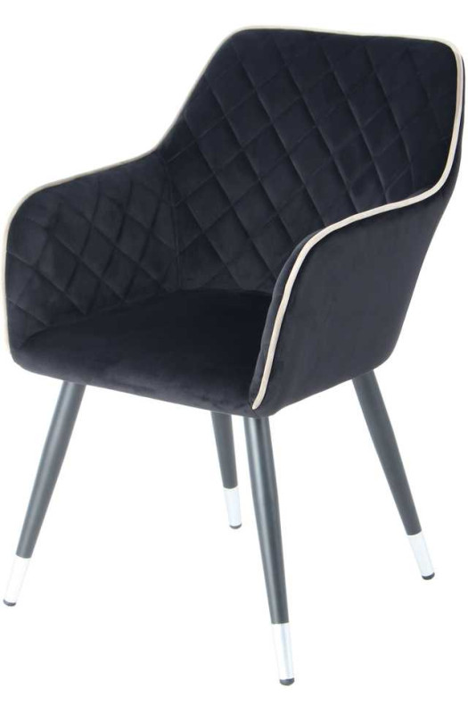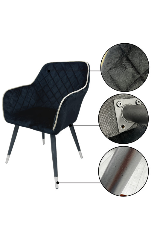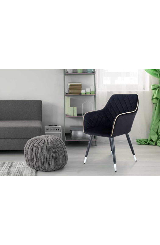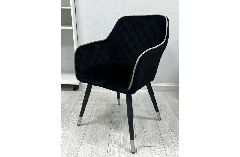 Оригінальна крісло для сучасного інтер'єру Стильне крісло Evan Black / Grey відмінне рішення для створення дизайну і в сучасному, і в класичному стилі. Виріб виконаний в чорному кольорі. Контрастний кант додає йому оригінальне звучання. Стійкі металеві ніжки чорного кольору органічно завершують композицію. Модель виконана в оксамитової, приємною на дотик оббивці. У наповненні використовується щільний пінополіуретан, який дарує м'якість і комфорт. Створіть затишну зону відпочинку в їдальні, кухні або вітальні за допомогою крісла Evan. Також модель можна використовувати для меблювання зони очікування в офісі. * Фактичний колір меблів може відрізнятися від фото, в залежності від налаштувань монітора.